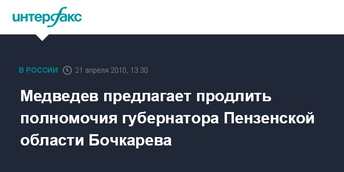 Москва. 21 апреля. INTERFAX.RU - Президент России Дмитрий Медведев внес на рассмотрение Законодательного собрания Пензенской области кандидатуру Василия Бочкарева для наделения его полномочиями губернатора, сообщает в среду пресс-служба Кремля.