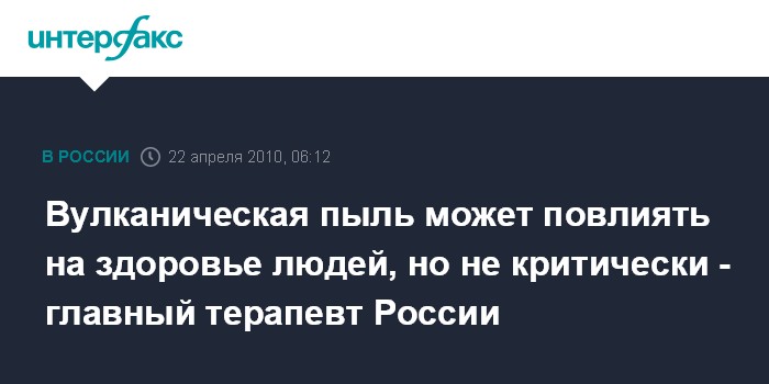 Москва. 22 апреля. ИНТЕРФАКС - Вулканическая пыль, попавшая в атмосферу после извержения вулкана в Исландии, может привести к ухудшению самочувствия у людей, страдающих заболеваниями дыхательной системы.