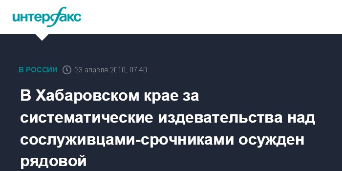 Хабаровск .23 апреля. ИНТЕРФАКС - ДАЛЬНИЙ ВОСТОК - Краснореченский военный суд Хабаровского края приговорил уроженца Челябинской области рядового Михаила Толоконникова к трем годам колонии поселения за издевательства над сослуживцами.