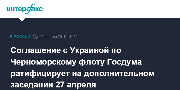 Москва. 23 апреля. INTERFAX.RU - Госдума проголосовала за проведение 27 апреля дополнительного заседания для того, чтобы ратифицировать подписанное президентами РФ и Украины соглашение о продлении срока базирования российского Черноморского флота в Севастополе.
