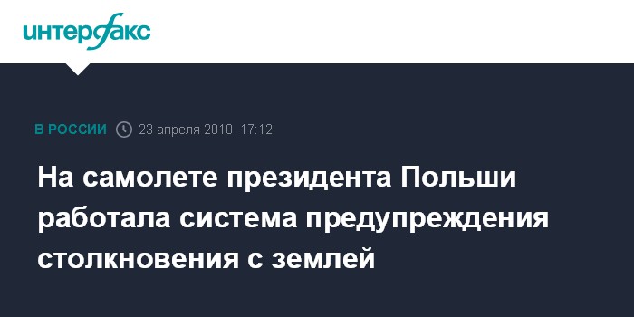 Москва. 23 апреля. INTERFAX.RU - На самолете президента Польши Леха Качиньского, который разбился 10 апреля под Смоленском, была включена бортовая система предупреждения столкновения с землей (TAWS), сообщили "Интерфаксу" в пятницу в Межгосударственном авиационном комитете (МАК). "По полученным данным расшифровки аварийных самописцев, система TAWS в полете на борту самолета была включена", - сказали в МАК.