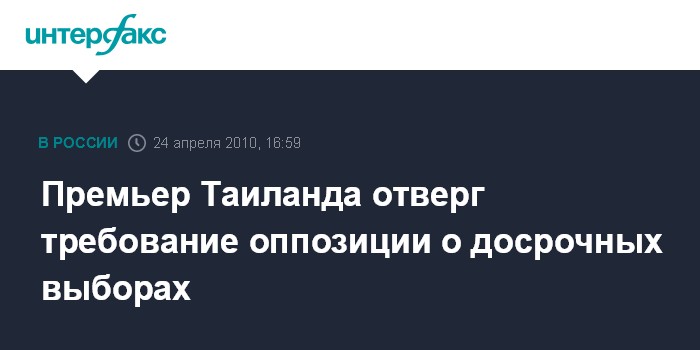 Москва. 24 апреля. INTERFAX.RU - Премьер-министр Таиланда Абхисит Бетчачива заявил в субботу, что отказывается выполнять требование оппозиционного движения "красных рубашек" о проведении досрочных парламентских выборов в ближайшие 30 дней, передает агентство ЭФЭ.