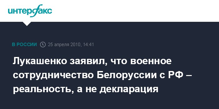 Минск. 25 апреля. INTERFAX.RU - Президент Белоруссии Александр Лукашенко заявил, что его страна идет навстречу российским пожеланиям в вопросах сотрудничества в военной сфере не декларациями, а реальными делами. "Только Белоруссия, исключительно Белоруссия, всегда шла навстречу российским пожеланиям и чаяниям", - заявил А.Лукашенко в беседе с журналистами в воскресенье в Минске