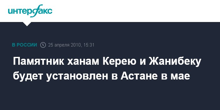 Астана. 25 апреля. INTERFAX.RU - Памятник основателям Казахского ханства Керею и Жанибеку будет установлен в Астане в конце мая текущего года, говорится в сообщении столичного акимата, размещенном на его сайте. К настоящему моменту уже определено, что памятник будет установлен "в излюбленном месте отдыха горожан и гостей столицы" - в сквере перед музеем Первого Президента Казахстана.