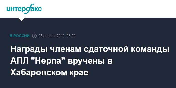 Хабаровск. 26 апреля. ИНТЕРФАКС-ДАЛЬНИЙ ВОСТОК - Торжественная церемония вручения государственных наград членам сдаточной команды ОАО "Амурский судостроительный завод" и ОАО "Амурская Эра", пострадавшим в результате аварии на атомной подводной лодке "Нерпа", состоялась в минувшую субботу в Комсомольске-на-Амуре (Хабаровский край).