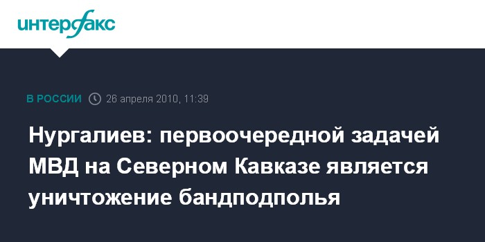Москва. 26 апреля. INTERFAX.RU - Министр внутренних дел РФ Рашид Нургалиев поставил задачу полностью уничтожить бандитское подполье на Северном Кавказе. "Нам еще многое предстоит сделать для укрепления законности и правопорядка в Северокавказском регионе. В первую очередь речь идет об окончательной ликвидации бандподполья", - заявил Р.Нургалиев на совещании в МВД Чечни. По его словам, "нужно признать, что в целом обстановка на Северном Кавказе остается сложной, а уровень террористической угрозы не снижается".