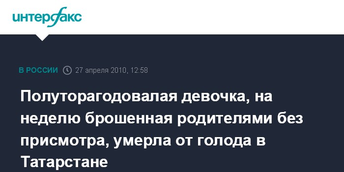 Труп девочки, которой было 1 год 4 месяца, обнаружил в квартире 22 апреля ее 29-летний отец. Согласно результатам вскрытия, причиной смерти ребенка стало истощение организма. По материалам следствия, 17 апреля мать с отцом ушли из дома, заперев девочку дома одну. Установлено, что родители отправились в магазин за водкой и по дороге потеряли друг друга из вида.