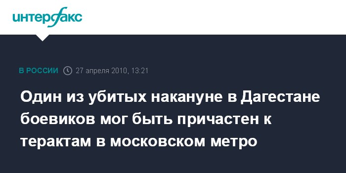 Москва. 27 апреля. INTERFAX.RU - Один из уничтоженных в понедельник в Дагестане боевиков проверяется на причастность к организации взрывов в московском метро, сообщил "Интерфаксу" источник в правоохранительных органах города.