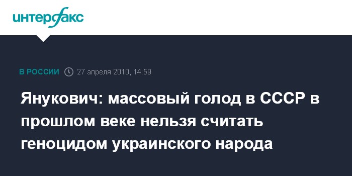 Москва. 27 апреля. INTERFAX.RU - Президент Украины Виктор Янукович заявил, что массовый голод в 30-х годах прошлого века был общей трагедией народов, входящих в СССР, и его нельзя считать геноцидом украинцев. "Голодомор был тогда и на Украине, и в России, в Белоруссии, Казахстане - это были последствия сталинского тоталитарного режима. Но признавать голодомор как факт геноцида по отношении к тому или иному народу мы считаем неправильным, несправедливым", - сказал В.Янукович, отвечая на вопросы парламентариев ПАСЕ.