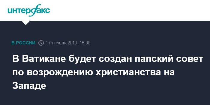 Москва. 27 апреля. INTERFAX.RU - Папа Римский Бенедикт XVI в ближайшее время объявит о создании в Ватикане папского совета по новой евангелизации Запада, сообщает итальянская газета "Джорнале". Совет, который, как ожидается, возглавит итальянский архиепископ Рино Физикелла, займется возрождением веры на развитом Западе, прежде всего в Европе и в Северной Америке.
