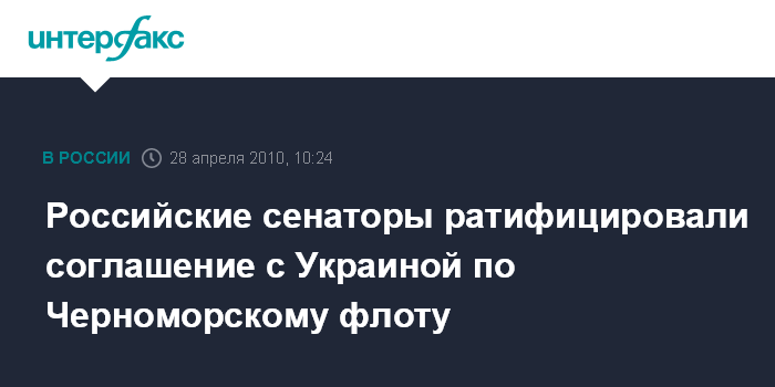Москва. 28 апреля. INTERFAX.RU - Совет Федерации в среду на заседании ратифицировал соглашение между Россией и Украиной по вопросам пребывания Черноморского флота РФ в Крыму. Накануне этот документ приняли Госдума и украинская Верховная Рада. Документ был подписан 21 апреля 2010 года в г.Харькове президентами России и Украины Дмитрием Медведевым и Виктором Януковичем.