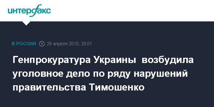 Киев. 28 апреля. INTERFAX.RU - Генеральная прокуратура Украины возбудила уголовное дело по фактам нарушения правительством Юлии Тимошенко законодательства о бюджетной системе и злоупотребления служебным положением при использовании средств, полученных в 2009 году от продажи квот на выбросы парниковых газов.