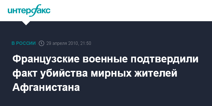 Париж. 29 апреля. INTERFAX.RU - Руководство вооруженных сил Франции подтвердило в четверг факт убийства по ошибке четверых афганских гражданских лиц во время военной операции, проведенной 6 апреля в провинции Каписа на северо-востоке Афганистана, сообщает агентство ЭФЭ.