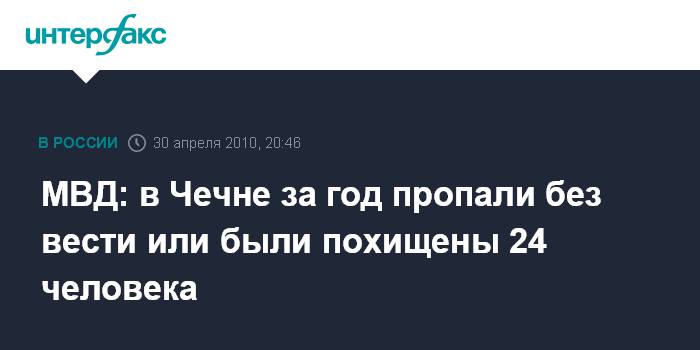 Грозный. 30 апреля. INTERFAX.RU - Число похищенных или пропавших без вести людей в Чечне за минувший год составило 24 человека, сообщили "Интерфаксу" в пресс-службе МВД республики в пятницу.