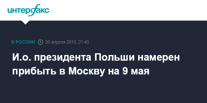 Варшава. 30 апреля. INTERFAX.RU - Исполняющий обязанности президента Польши спикер польского Сейма (нижняя палата парламента - ИФ) Бронислав Коморовский заявил о намерении 8 мая вылететь в Москву для участия в праздновании 65-летнего юбилея Победы над нацистской Германией, сообщают польские СМИ.