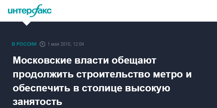 Он отметил, что при всех условиях правительство Москвы и Мосгордума решают вопросы продолжения строительства метро. Мэр заявил также, что в этом году власти города гарантируют, что они будут работать над тем, чтобы занятость в городе была самой высокой в стране.