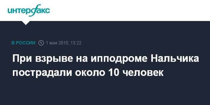Москва. 1 мая. INTERFAX.RU - По предварительным данным, около 10 человек пострадали в результате взрыва на ипподроме Нальчика, сообщил "Интерфаксу" источник в правоохранительных органах Кабардино-Балкарии.