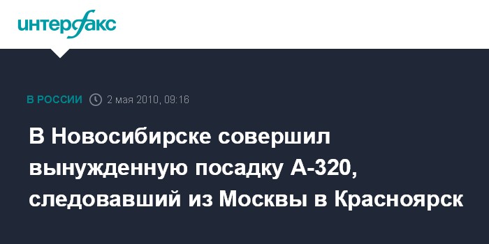 Как сообщила агентству "Интерфакс-Сибирь" старший помощник Западно- Сибирского транспортного прокурора Оксана Горбунова, в 5:30 по местному времени в воскресенье самолет А-320, следовавший рейсом Москва- Красноярск, в связи с отказом одного из навигационных приборов совершил вынужденную посадку в Новосибирске.