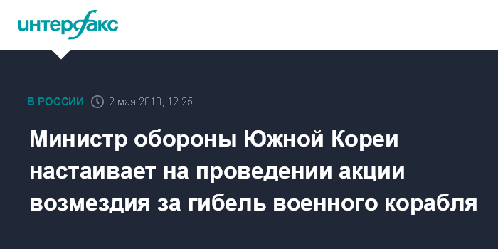 Лондон. 2 мая. INTERFAX.RU - Министр обороны Южной Кореи Ким Тхэ Ен заявил о необходимости наказать ответственных за гибель южнокорейского корвета "Чхонан" и 46 членов его экипажа, сообщает в воскресенье Би-би-си. Глава оборонного ведомства в интервью местному телевидению высказался за проведение акции возмездия, не уточнив, в чем она должна заключаться.