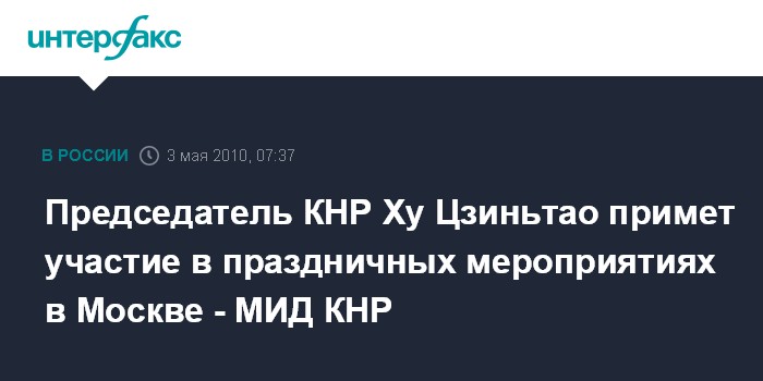 "По приглашению президента РФ Дмитрия Медведева, председатель КНР Ху Цзиньтао с 8 по 9 мая 2010 года примет участие в праздничных мероприятиях в Москве по случаю 65-й годовщины победы в Великой Отечественной войне", - сообщила официальный представитель МИД КНР Цзян Юй.