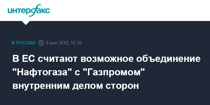 Брюссель. 3 мая. INTERFAX.RU - Возможное объединение Национальной акционерной компании "Нафтогаз Украины" и российского ОАО "Газпром" является внутренним делом сторон, для ЕС важно, чтобы Украина продолжила реформы в сфере газового рынка, заявила представитель Еврокомиссии по энергетическим вопросам Марлен Холзнер (Marlen Holzner).