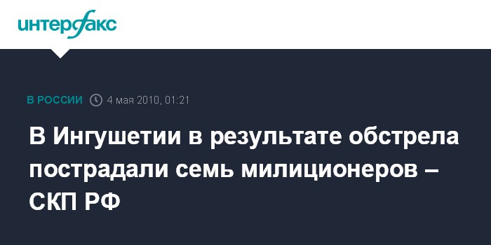 Назрань. 4 мая. ИНТЕРФАКС-ЮГ- Семь милиционеров были контужены в результате обстрела неизвестными контрольно-пропускного пункта милиции в Назрани, сообщила агентству "Интерфакс-Юг" официальный представитель СКП РФ по Ингушетии Светлана Горбакова.