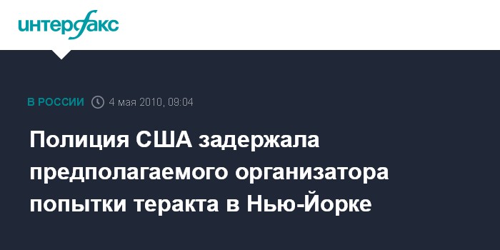 Москва. 4 мая. INTERFAX.RU - Американские полицейские задержали во вторник гражданина США пакистанского происхождения, предположительного, причастного к попытке теракта в Нью-Йорке, сообщает веб-сайт газеты "Нью-Йорк таймс".