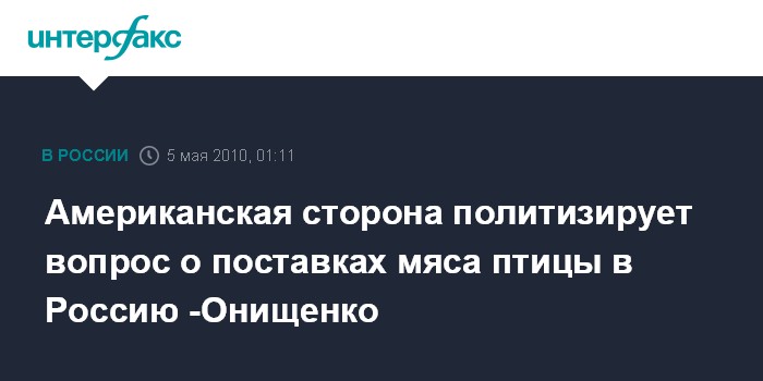Он сказал, что производителя мяса птицы в США оказывают давление на американские власти, чтобы они завершили переговоры с РФ по вопросу о возобновлении поставок куриного мяса. "Американские производители боятся опоздать с выборкой квот для поставок мяса в Россию", - сообщил Г.Онищенко.