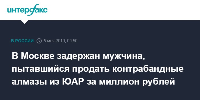 Москва. 5 мая. INTERFAX.RU - Сотрудники главного управления МВД России по ЦФО задержали в Москве мужчину, который пытался продать пять контрабандных алмазов, сообщили "Интерфаксу" в пресс-службе ГУ МВД по ЦФО в среду. Москвич был задержан прямо в помещении банка, куда он приехал с потенциальными покупателями для того, чтобы совершить сделку и проверить подлинность полученных за алмазы денег. Информация о том, что некий житель Москвы ищет покупателей алмазов, поступила в милицию около месяца назад.