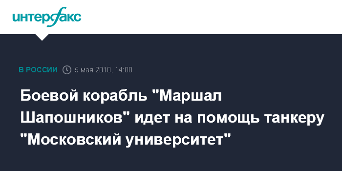 Москва. 5 мая. INTERFAX.RU - Большой противолодочный корабль (БПК) "Маршал Шапошников" идет на помощь танкеру "Московский университет", который в среду утром был атакован пиратами в 350 милях от берега к востоку от Аденского залива. Об этом заявил "Интерфаксу-АВН" представитель управления пресс-службы и информации Минобороны РФ.
