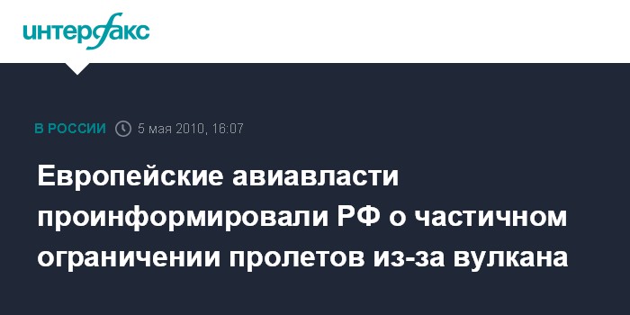 Москва. 5 мая. INTERFAX.RU - Европейские авиавласти проинформировали Росавиацию о частичном ограничении пролетов в воздушном пространстве Ирландии и Западной Шотландии из-за извержения исландского вулкана и распространения пепла, сообщили "Интерфаксу" в Росавиации. В российском ведомстве подчеркнули, что над территорией РФ распространения вулканического пепла не наблюдается.