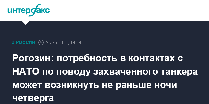 Но потребность в контактах с НАТО возникнет только после того, как ситуация будет проанализирована, то есть после непосредственного визуального контакта наших военных моряков с захваченным судном, отметил Рогозин.