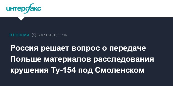Москва. 6 мая. INTERFAX.RU - Россия рассматривает вопрос о передаче польской стороне материалов расследования причин катастрофы самолета Ту-154 под Смоленском 10 апреля, сообщил генпрокурор РФ Юрий Чайка.