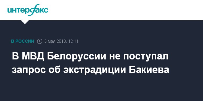 Москва. 6 мая. INTERFAX.RU - Министерство внутренних дел Белоруссии не получало запроса по линии Интерпола по экстрадиции Курманбека Бакиева, заявил журналистам в четверг в Минске глава МВД Анатолий Кулешов.