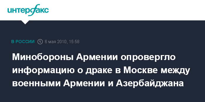 Москва. 6 мая. INTERFAX.RU - Министерство обороны Армении опровергло распространенную азербайджанскими СМИ информацию о драке с участием азербайджанских и армянских военнослужащих, прибывших в Москву для участия в Параде Победы. "Никакой драки не было. Информация не соответствует действительности", - сказал журналистам пресс-секретарь министра обороны Армении полковник Сейран Шахсуварян в четверг.