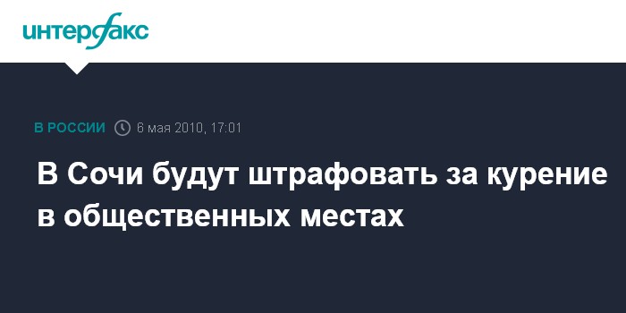 Москва. 6 мая. INTERFAX.RU - Власти Сочи планируют ввести штрафы за курение в общественных местах. "Штрафы будут. Бюджет города, полагаю, неплохо пополнится из-за курильщиков", - написал в своем блоге в Интернете мэр города Анатолий Пахомов, напомнив, что Сочи был объявлен городом, свободным от табачного дыма. По его словам, зонами без табака теперь являются все учреждения образования, здравоохранения и культуры. Нельзя курить в общественных местах - парках, скверах и пляжах.