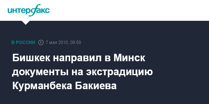 По его словам, 4 мая соответствующая санкция была дана Первомайским судом столицы Киргизии, а генеральная прокуратура 6 мая, отправила в Белоруссию все необходимые документы для выдачи Бакиева.