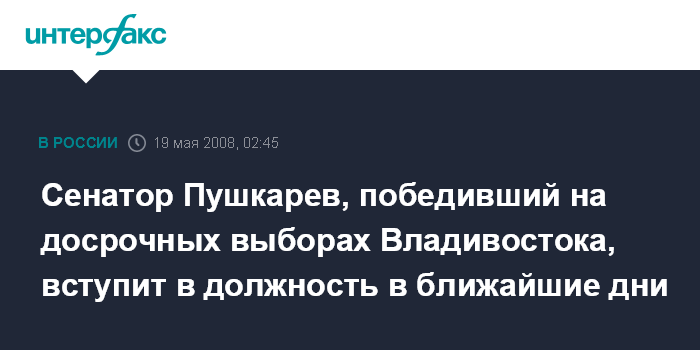 Владивосток. ИНТЕРФАКС-ДАЛЬНИЙ ВОСТОК - Кандидат от "единороссов" сенатор Игорь Пушкарев, который в воскресенье победил в первом же туре на досрочных выборах мэра Владивостока, в ближайшие дни сможет вступить в должность.