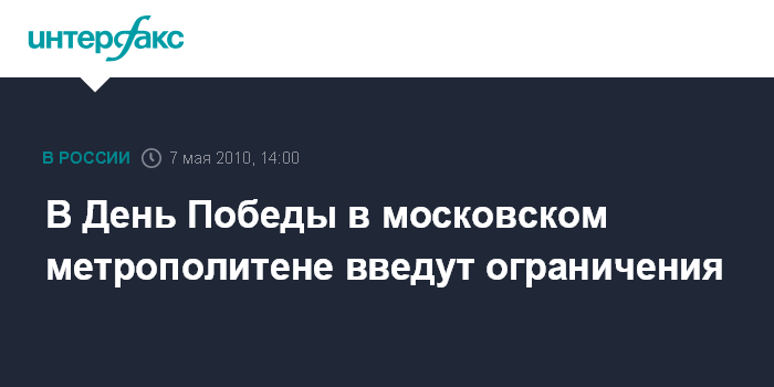 Москва. 7 мая. INTERFAX.RU - В День 65-летия Победы в связи с проведением праздничных мероприятий в московском метро введут ряд ограничений, сообщили "Интерфаксу" в пятницу в пресс-службе метрополитена.