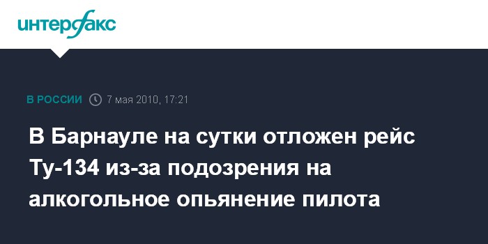 Барнаул. 7 мая. INTERFAX.RU - Рейс Ту-134 авиакомпании "Космос" не смог в пятницу вылететь из Барнаула в Норильск из-за подозрения на алкогольное опьянение одного из летчиков экипажа, сообщила агентству "Интерфакс" старший помощник Западно-Сибирского транспортного прокурора по взаимодействию со СМИ и общественностью Оксана Горбунова.