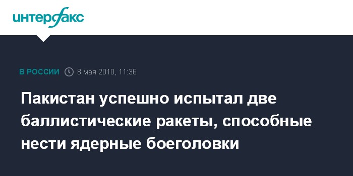 Москва. 8 мая. INTERFAX.RU - Вооруженные силы Пакистана провели в субботу успешные испытания ракеты малой дальности "Шахин-1", а также ракеты средней дальности "Газнави", сообщается в коммюнике армии Пакистана. Дальность полета ракеты "Шахин-1" составляет 650 км, а "Газнави" - 290 км. Обе ракеты способны нести ядерные и обычные боезаряды.