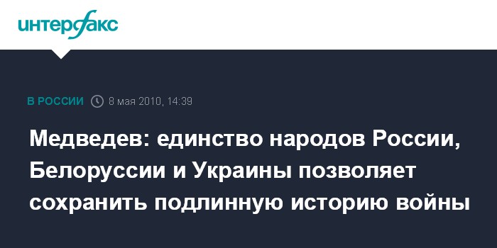 Москва. 8 мая. INTERFAX.RU - Единство народов России, Белоруссии и Украины является гарантией того, что никто не сможет оспорить исторические факты о Великой Отечественной войне, заявил президент РФ Дмитрий Медведев.