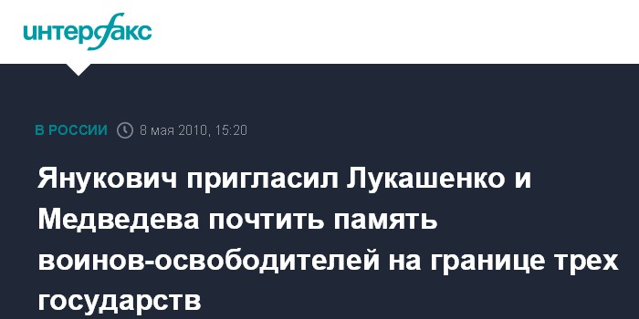 Москва. 8 мая. INTERFAX.RU - Президент Украины Виктор Янукович намерен пригласить своих российского и белорусского коллег Дмитрия Медведева и Александра Лукашенко почтить память воинов-освободителей на перекрестье границ трех государств.