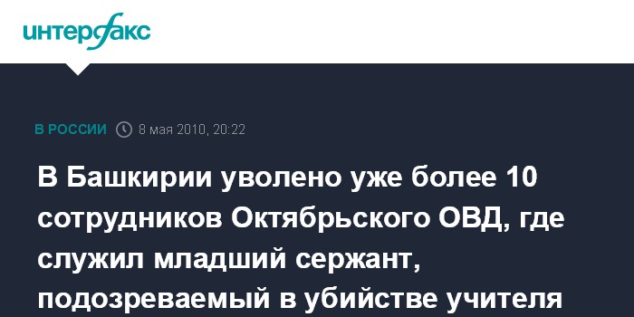 Уфа. 8 мая. ИНТЕРФАКС-ПОВОЛЖЬЕ - МВД по Башкирии уволило уже более 10 сотрудников руководящего звена из различных управлений ОВД по городу Октябрьский, где служил подозреваемый в убийстве младший сержант вневедомственной охраны Владислав Симухин.