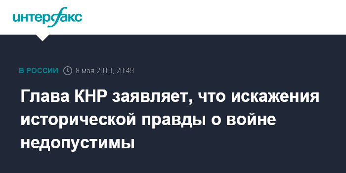 "В течение последних лет некоторыми силами в мире предпринимаются попытки переписать историю с целью перечеркнуть выдающийся вклад Советского Союза в победу во Второй мировой войне. По вопросам оценки Второй мировой войны у нас идентичные позиции с российской стороной", - заявил Ху Цзиньтао на встрече с премьер-министром РФ Владимиром Путиным в его подмосковной резиденции.