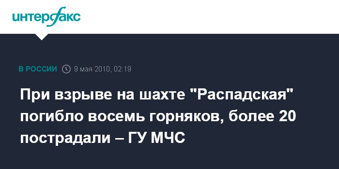 Кемерово. 9 мая. ИНТЕРФАКС-СИБИРЬ - В ГУ МЧС РФ по Кемеровской области подтвердили информацию о восьми погибших и более 20 пострадавших в результате взрыва метана на шахте "Распадская" в Кемеровской области.