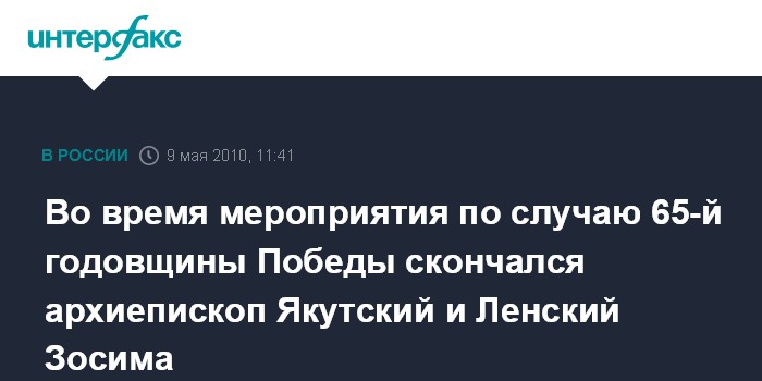 Москва. 9 мая. INTERFAX.RU - В воскресенье, во время одного из мероприятий по случаю 65-й годовщины Победы, на стадионе "Туймаада" в Якутске скоропостижно скончался архиепископ Якутский и Ленский Зосима (Давыдов).