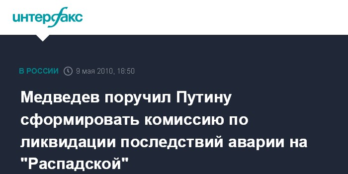 Москва. 9 мая. INTERFAX.RU - Президент РФ Дмитрий Медведев поручил премьеру Владимиру Путину сформировать правительственную комиссию по ликвидации последствий аварии на шахте "Распадская" и оказанию с помощи семьям погибших и пострадавших, сообщила пресс-секретарь главы государства Наталья Тимакова.