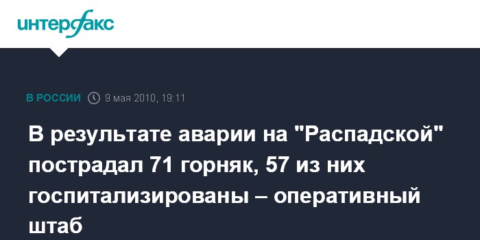 Москва. 9 мая. INTERFAX.RU - В больницах находится 57 человек, пострадавших в результате взрывов на шахте "Распадская" в Кемеровской области, сообщает оперативный штаб по проведению поисково-спасательных работ.