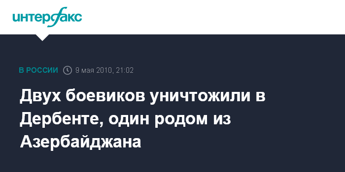 Ростов-на-Дону. 9 мая. ИНТЕРФАКС-ЮГ - Двое участников бандгруппы ликвидированы в ходе спецоперации, проведенной в дагестанском Дербенте, сообщили агентству "Интерфакс-Юг" в городском отделе внутренних дел.